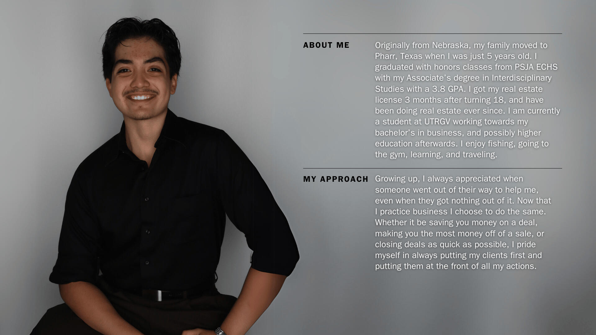 As a dedicated Realtor based in the beautiful Rio Grande Valley, I’ve built my career around one principle: delivering results that exceed expectations. While I am currently attending UTRGV, I’ve honed my skills, not just in academics but in understanding the unique needs of our community across all walks of life.Whether you’re looking to buy, sell, lease, build, or invest, my goal is simple: to help you earn the most money, secure the best deals, and do it all in the shortest time possible. I’m here to guide you every step of the way with unwavering commitment and local expertise.Let’s work together to make your goals a reality.